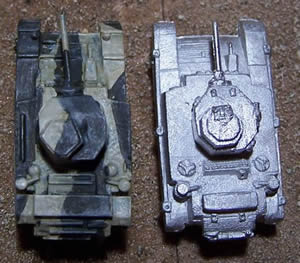 Minifigs Honeys (aka M3 Stuart) These models look good when assembled, but are a bugger to get the tracks to fit. After trying much filing, I discovered that clipping the joins between the lower and upper suspension, allowed the tracks to be squashed a little, which gave a much better fit.