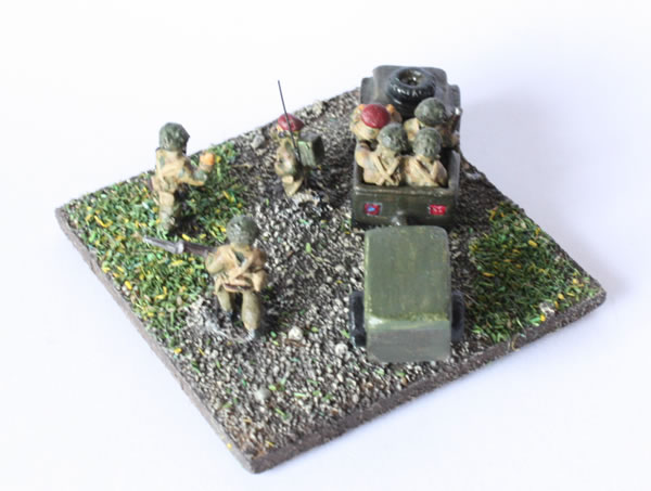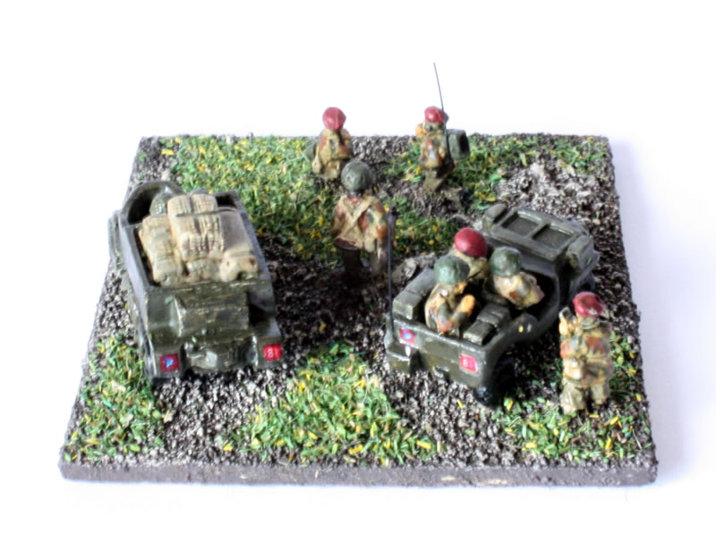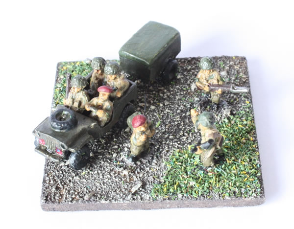 1st Battalion HQ Stand. Pithead Figures and airborne jeep with trailer. The decals are home made.