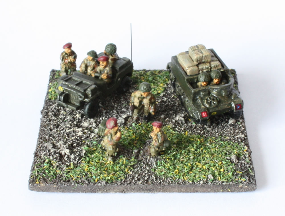 1st Parachute Brigade HQ Stand - a mix of Pithead and Pendraken figures, with Pithead airborne radio jeep and airborne carrier, with load of wicker baskets. This photo is about 4x the actual size of the figures. Decals are a mix of home-made and Scale Specialties.