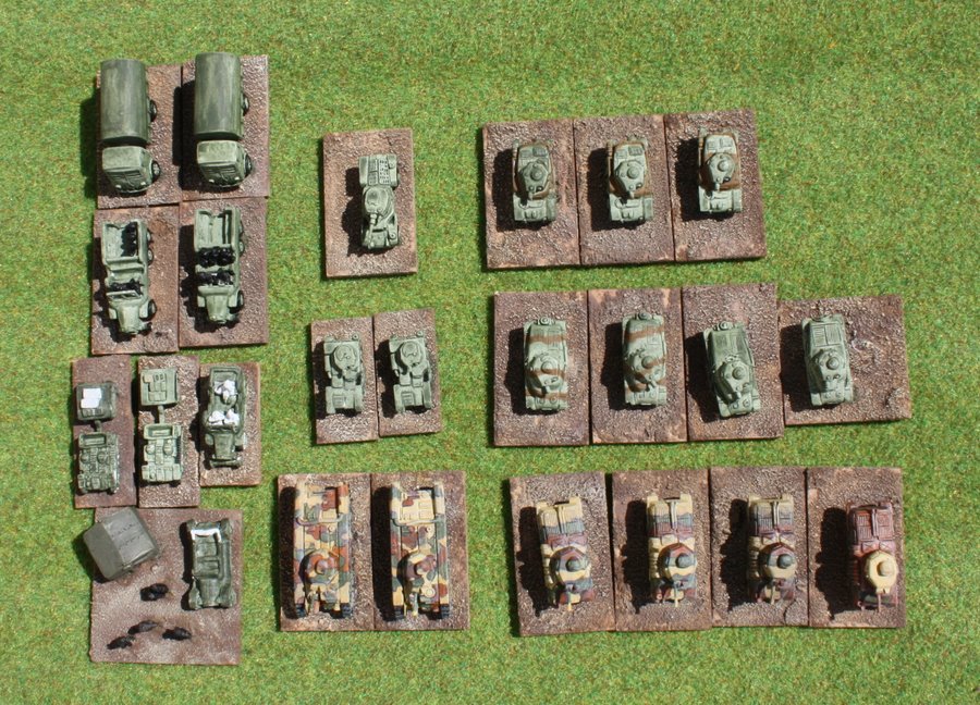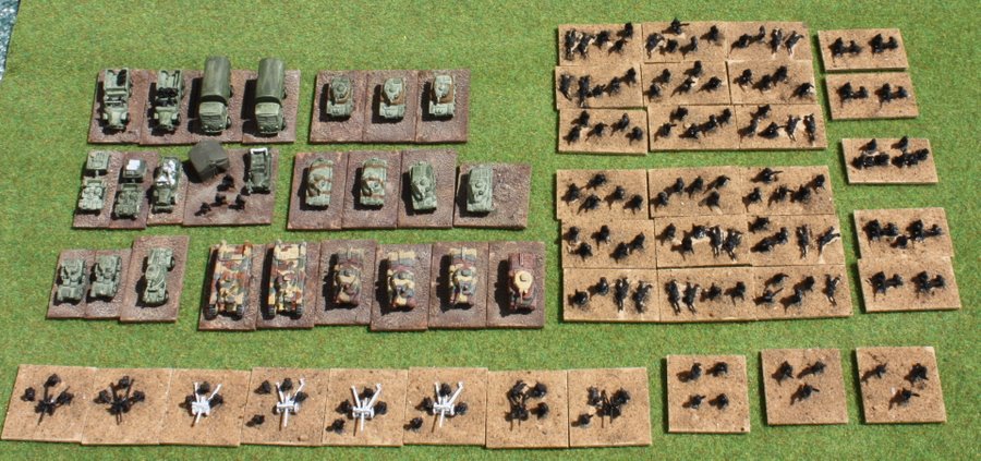 Overview of the whole battlegroup - a collection that was unlikely to be fielded together! 1.5 battalions of infantry with MGs and mortars on the right (unpainted). With 5 x 25mm AT guns and 3 47mm AT Guns (probably too many) then the AFVs and transport as seen above.