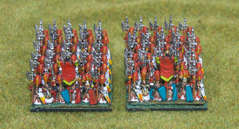 Two units of archers and two of spearmen, all metal GW Warmaster High Elf figures. Painted in red and white, to go with the red Dragon, and to provide some contrast from all the blue.