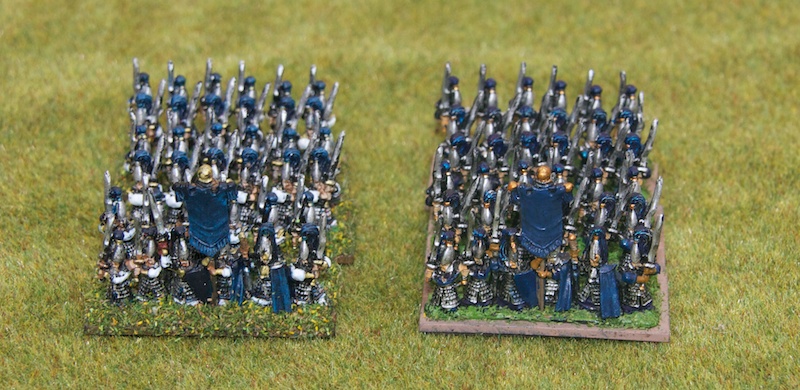 Two units of Warmaster metal eagles, which are too big for the bases and need careful arrangement to fit together as a unit. And two units of the much smaller BoFA plastic eagles. I have mounted these on brass rod, and the eagles can be rotated to either face forwards to the short edge, or to the long edge of the base.