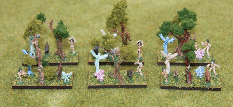 The troop type is described as "Spirits and faery folk of the forest realms ... humanoid elementals of nature, fighting with the fury of the Great Wild". The figures are a mixture of manufactureres and scales, there are some Pendraken spirits, the tree dryads are Splintered light 15mm, the small fairies are 6mm from Micro World Games, and the other humanoids and dogs are Eureka. I'm quite pleased with how these came out - as when I had the different figures on painting sticks it was all looking a bit odd. I have a few Centaurs coming from Pendraken to finish off the other stands, and am going to try to make some flying fairies as well.